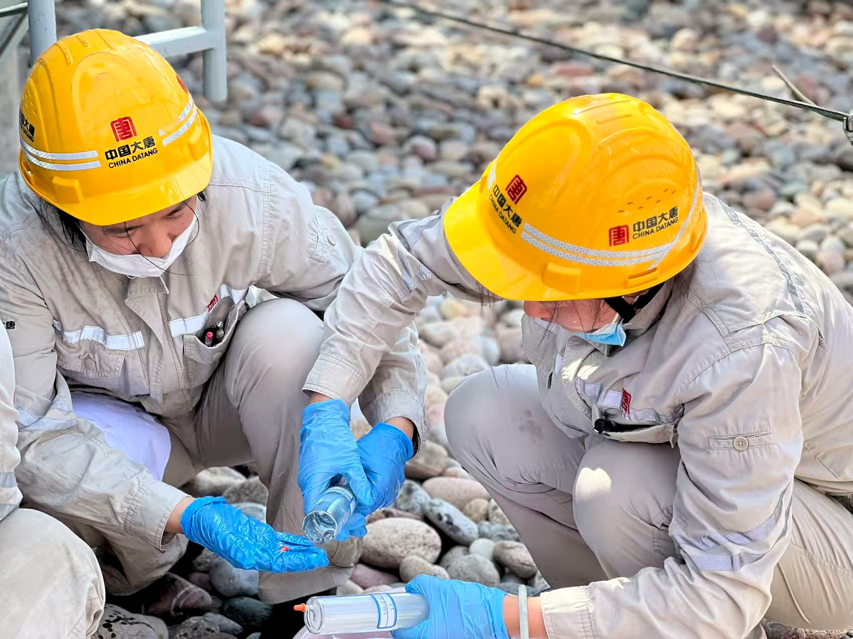 4位身着工装的“娘子军”手提取样瓶,穿梭在设备之间——有人手里攥着棉布,随时准备擦拭取样瓶;有人护着装满油样的取样瓶,生怕被阳光直射影响样品质量。尽管脸庞被晒得通红,汗水在安全帽带下汇成细流往下淌,但递工具、接样品、擦瓶身、封瓶口的动作,始终有条不紊、一丝不乱。
